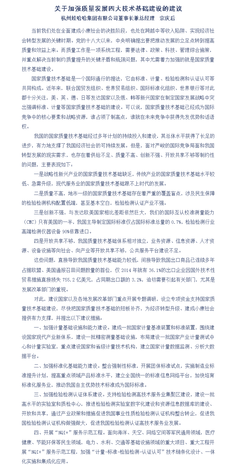 2016年全国人大代表宗庆后建议(八):关于加强质量发展四大技术基础建设的建议