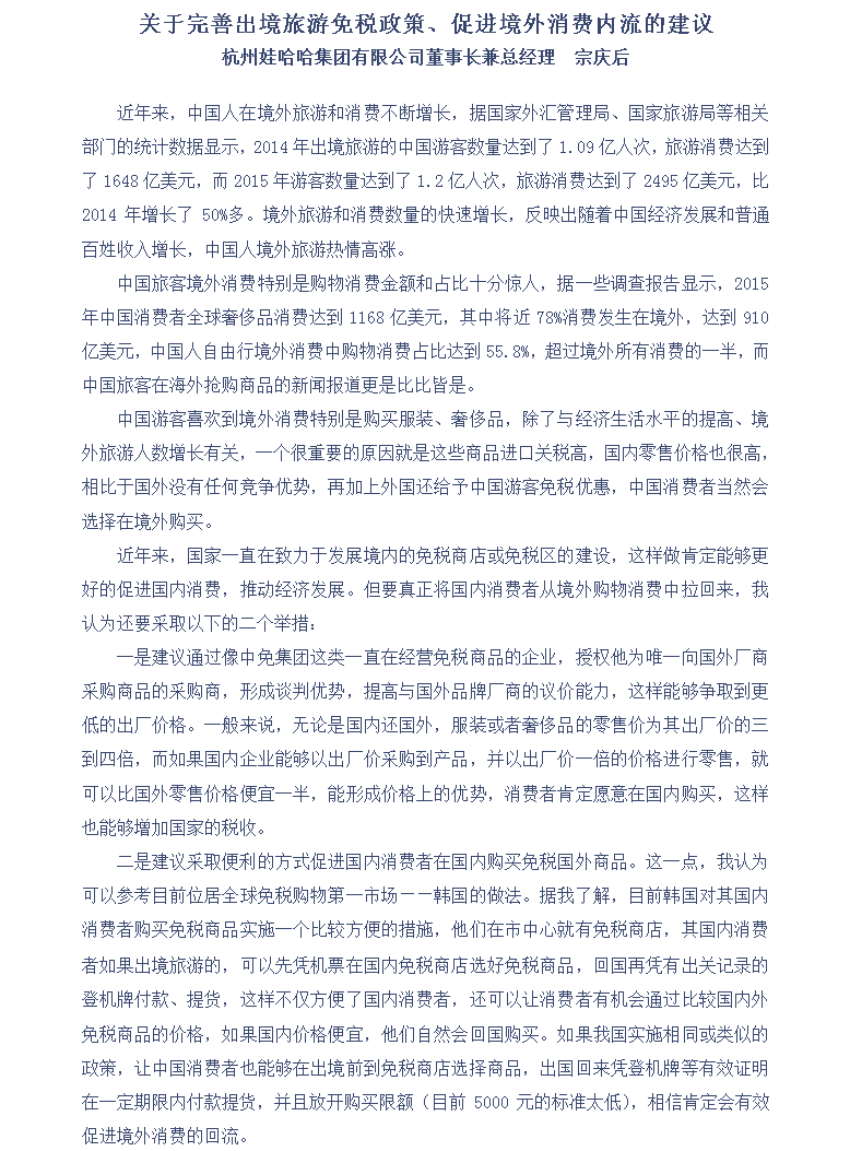 2016年全国人大代表宗庆后建议(六):关于完善出境旅游免税政策、促进境外消费内流的建议