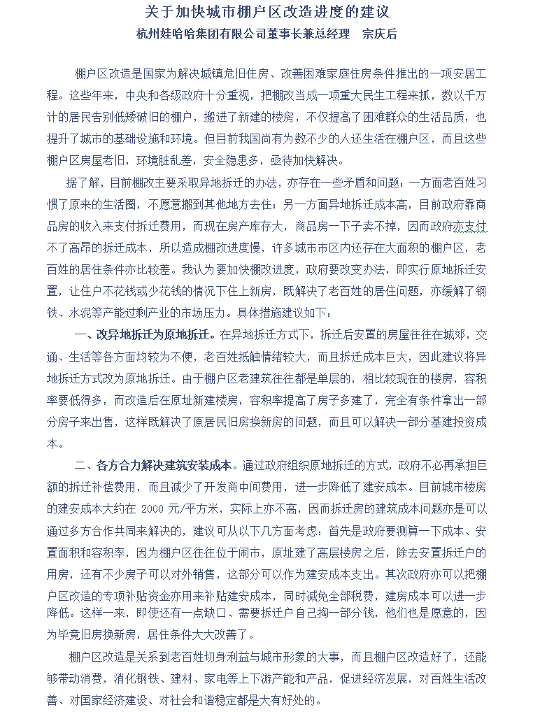 2016年全国人大代表宗庆后建议(五):关于加快城市棚户区改造进度的建议