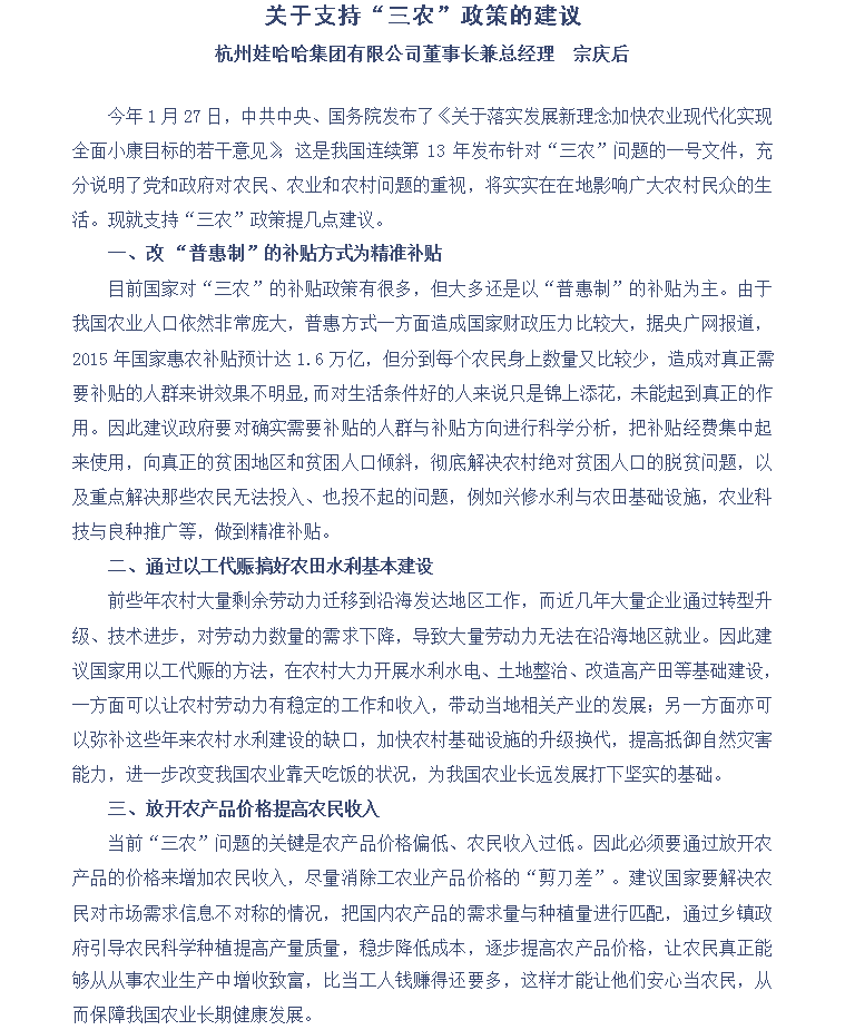 2016年全国人大代表宗庆后建议(三):关于支持“三农”政策的建议