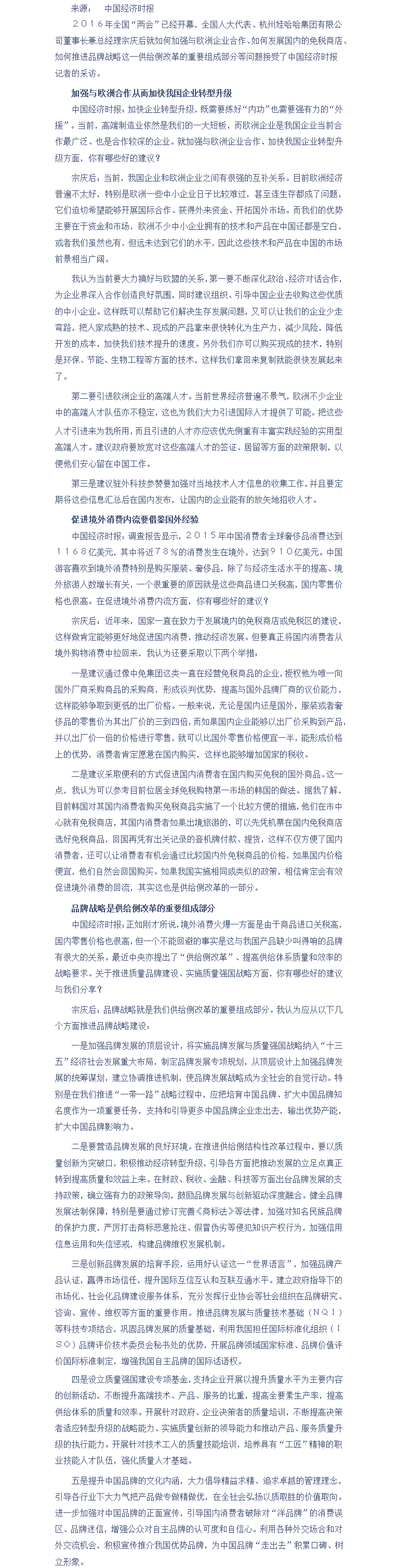 宗庆后:推进品牌战略是供给侧改革的主要部分