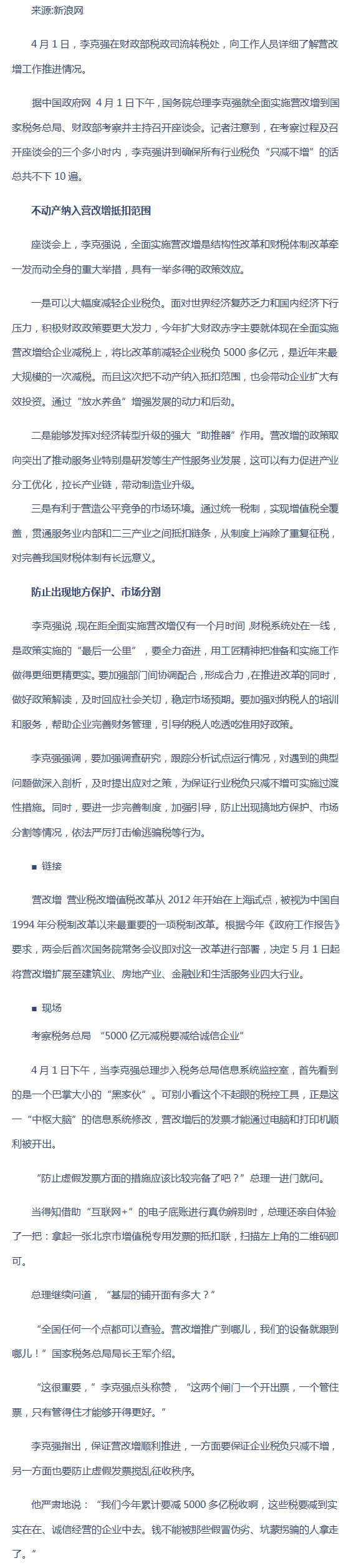 李克强:今年营改增将为企业减税负5000多亿