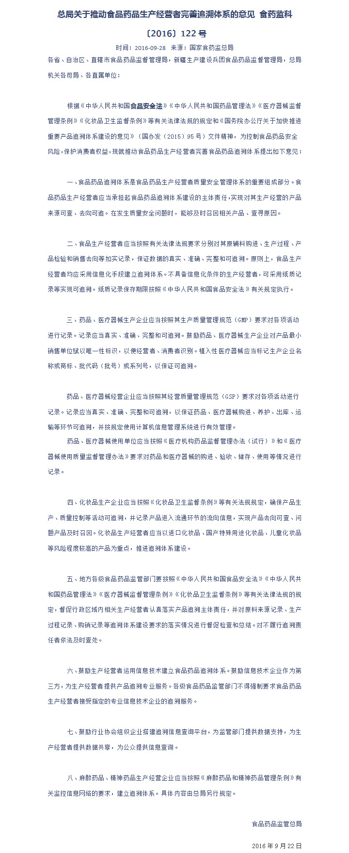 总局关于推动食品药品生产经营者完善追溯体系的意见 食药监科〔2016〕122号