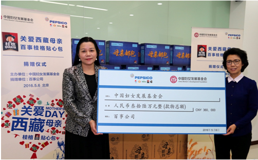2016年5月6日,在母亲节来临之际,百事公司大中华区(以下简称“百事公司”)在京宣布捐赠总价值为36万元人民币的“百事桂格贴心包”,再次支持由中国妇女发展基金会(以下简称妇基会)发起的“母亲邮包”项目。此次捐赠将为西藏自治区的拉萨、那曲、阿里、昌都等地区的3000位贫困母亲送去日常生活必需品和百事桂格营养产品,让她们度过一个健康温馨的母亲节。中国妇女发展基金会副理事长、秘书长秦国英,百事公司大中华区集团事务部副总裁邰祥梅和西藏自治区代表共同参加了捐赠仪式。