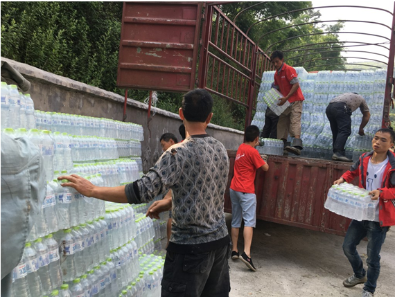 灾民和志愿者一起赠送饮用水