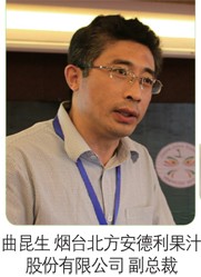烟台北方安德利果汁股份有限公司的曲昆生副总裁分享了浓缩果蔬汁(浆)加工的节能降耗技术,这些技术不需要企业有很高的投入,但却能改变浓缩果蔬汁(浆)生产能耗高的现状,为果汁企业在高成本运营的大环境下提供了科学控制成本的可行办法。