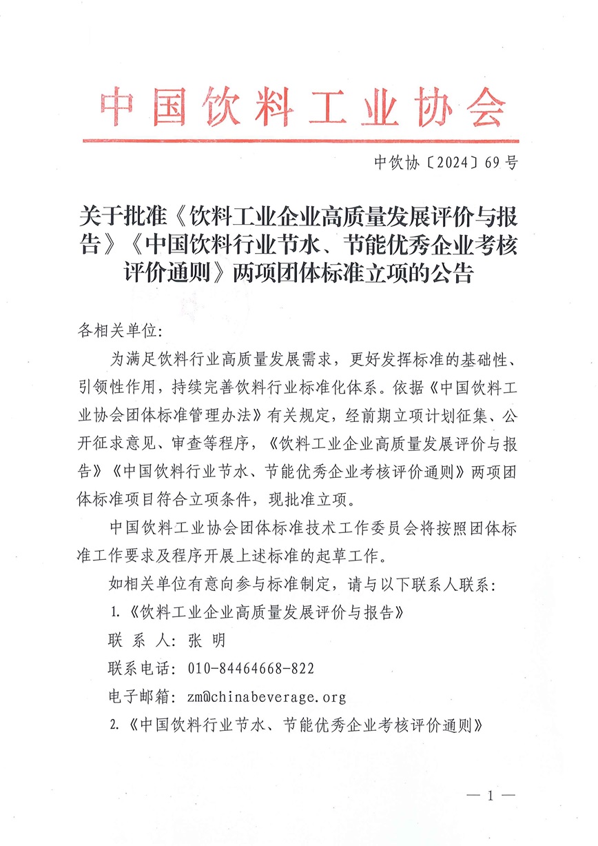 关于批准《饮料工业企业高质量发展评价与报告》《中国饮料行业节水、节能优秀企业考核评价通则》两项团体标准立项的公告
