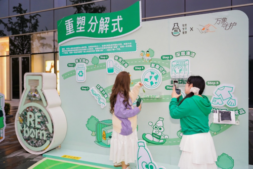 展览现场,市民还通过“重塑等式墙” “重塑分解式”等清晰地了解到饮料塑料瓶与再生物品的“换算”关系,以及塑料瓶如何从回收、重塑到再生,最终成为再生面料,塑料瓶的再生潜力让参观者啧啧称奇。花园中还设置有游戏互动摊位,市民可以通过参与趣味问答,把可爱的“重塑”IP挂件带回家。