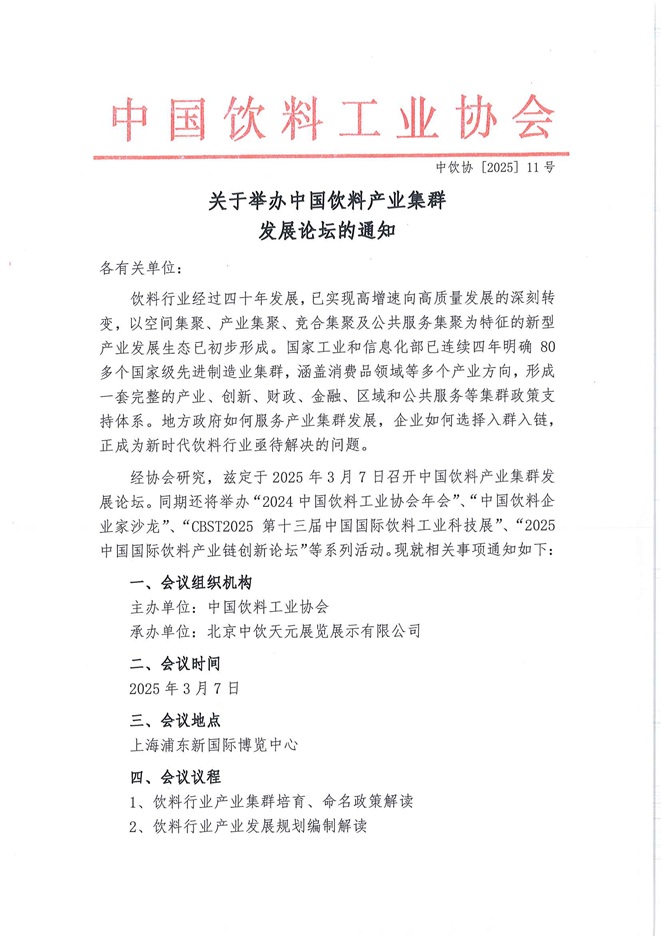 关于举办中国饮料产业集群发展论坛的通知