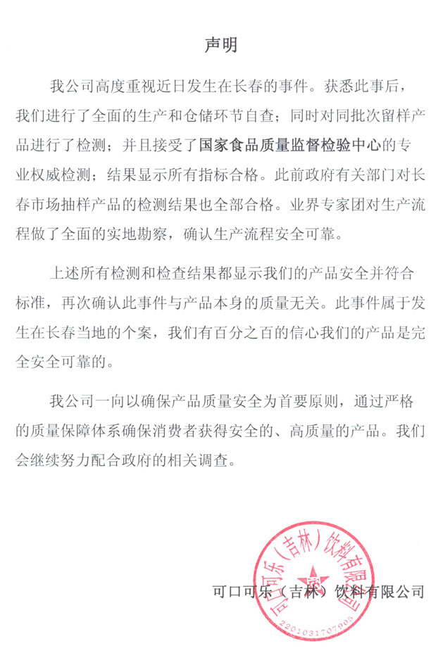 可口可乐公司关于果粒奶优产品的声明